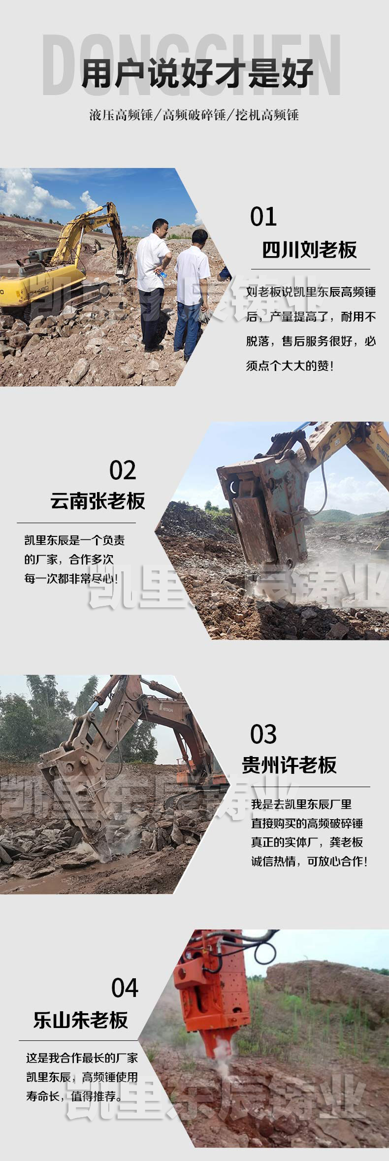 高頻破碎錘哪里買 貴州凱里東辰現貨供應,高頻破碎器是集機械液壓力學及數字信號、數字化監控為一體的物理破碎設備。其破碎齒可在激振器的作用下對物體產生巨大沖擊力,進而實現破碎。具有工作時沒有噪聲污染,對挖機液壓系統無沖擊,破碎力量大、效率高、堅固耐用且損耗低、工作效率高等諸多節能環保的優點。低噪音設計:有噪音限制的城區,通過減震橡膠墊,和密封箱有效降低噪音,可選用低噪音托架破碎器。